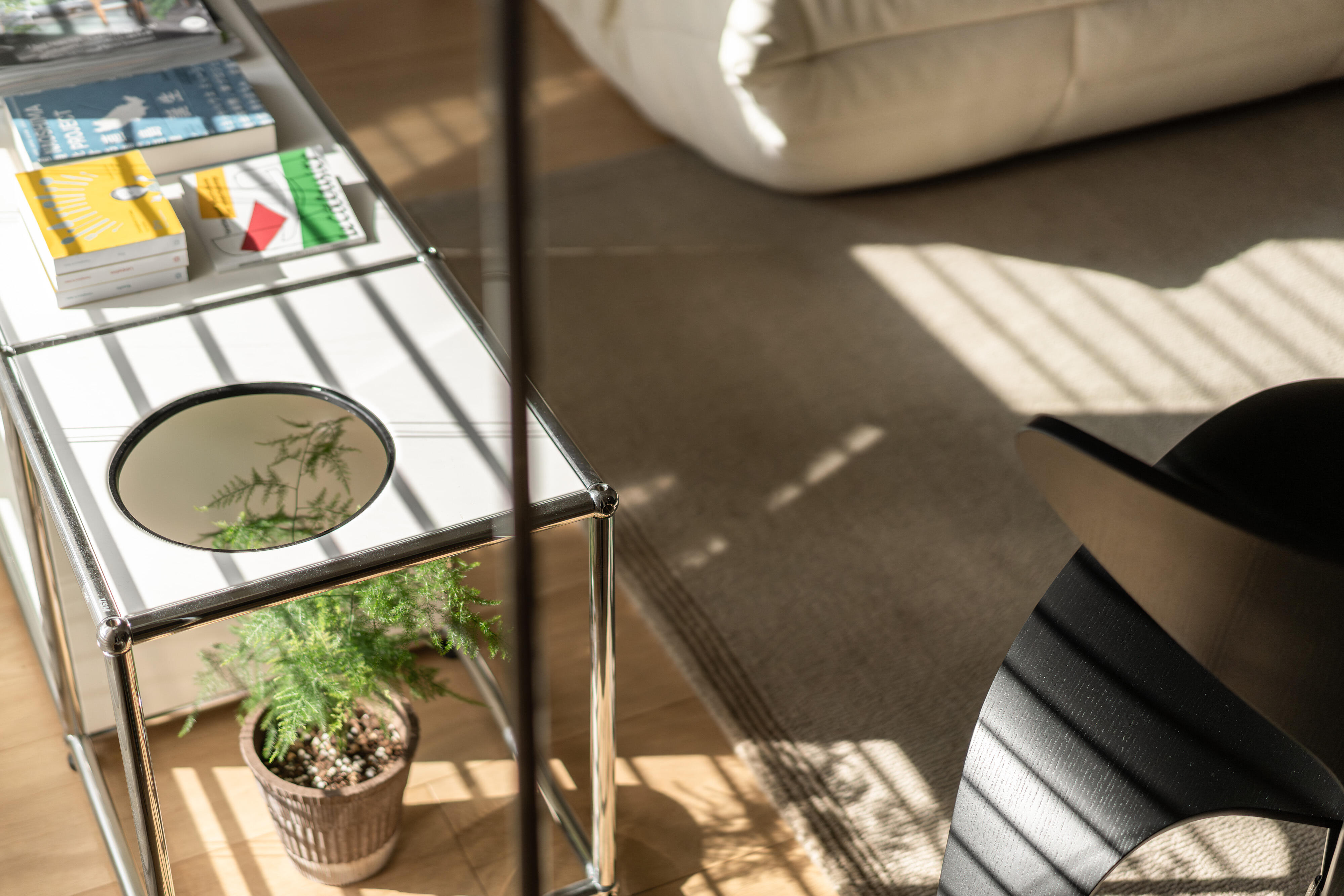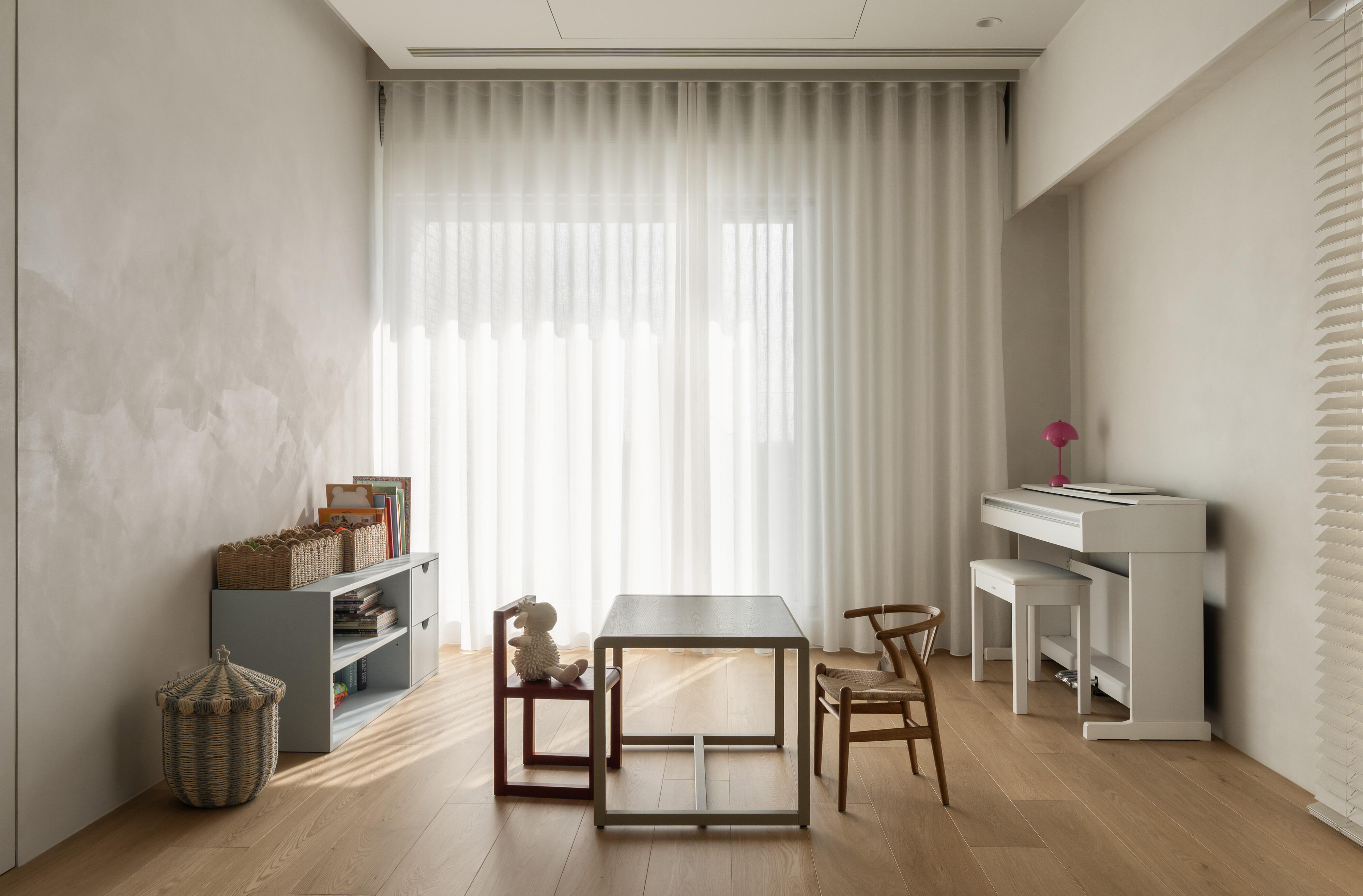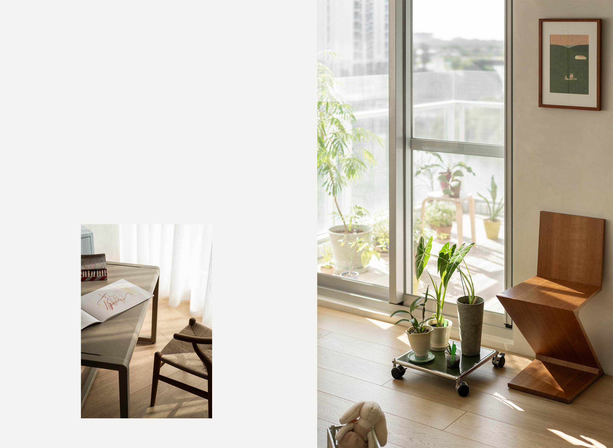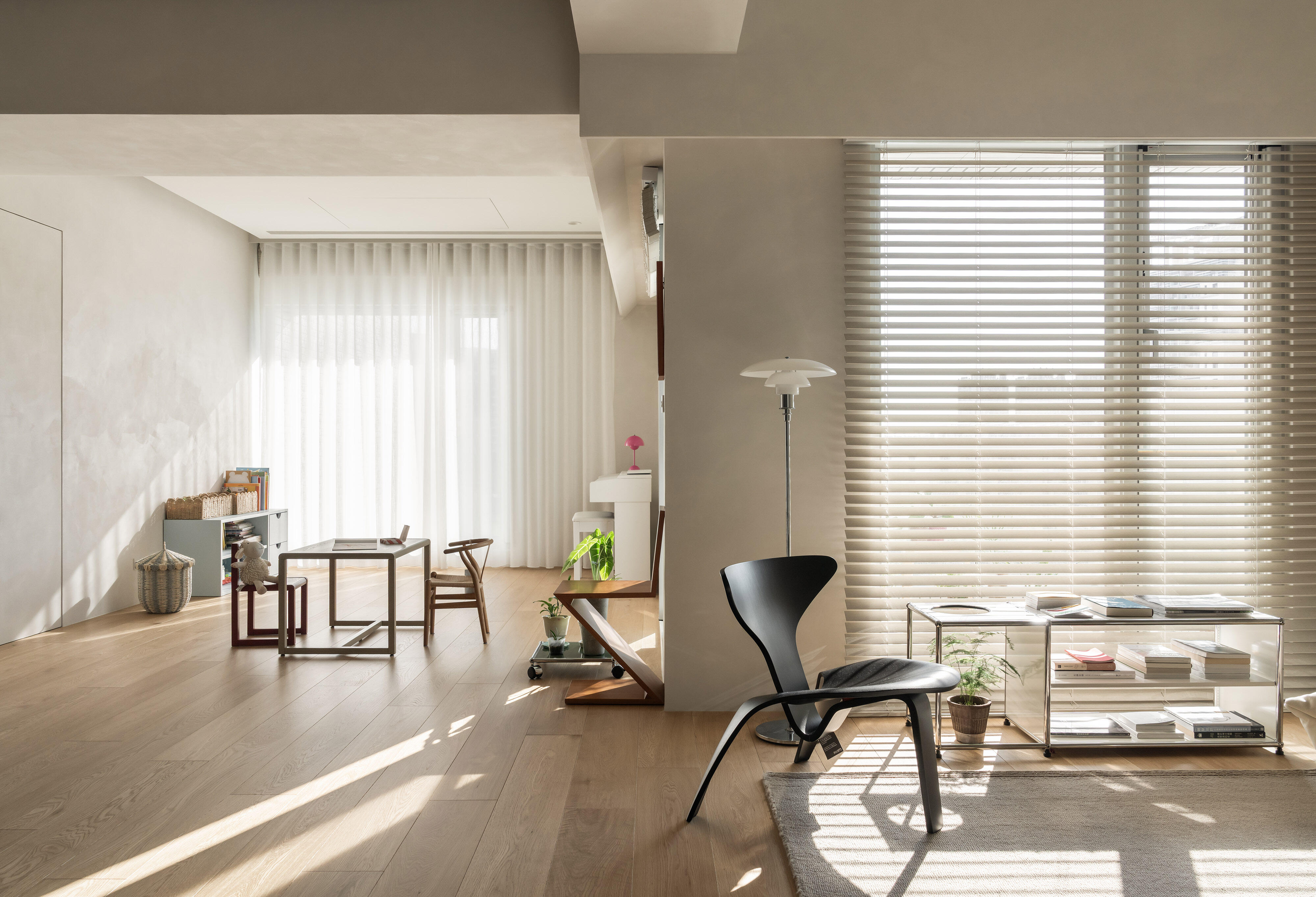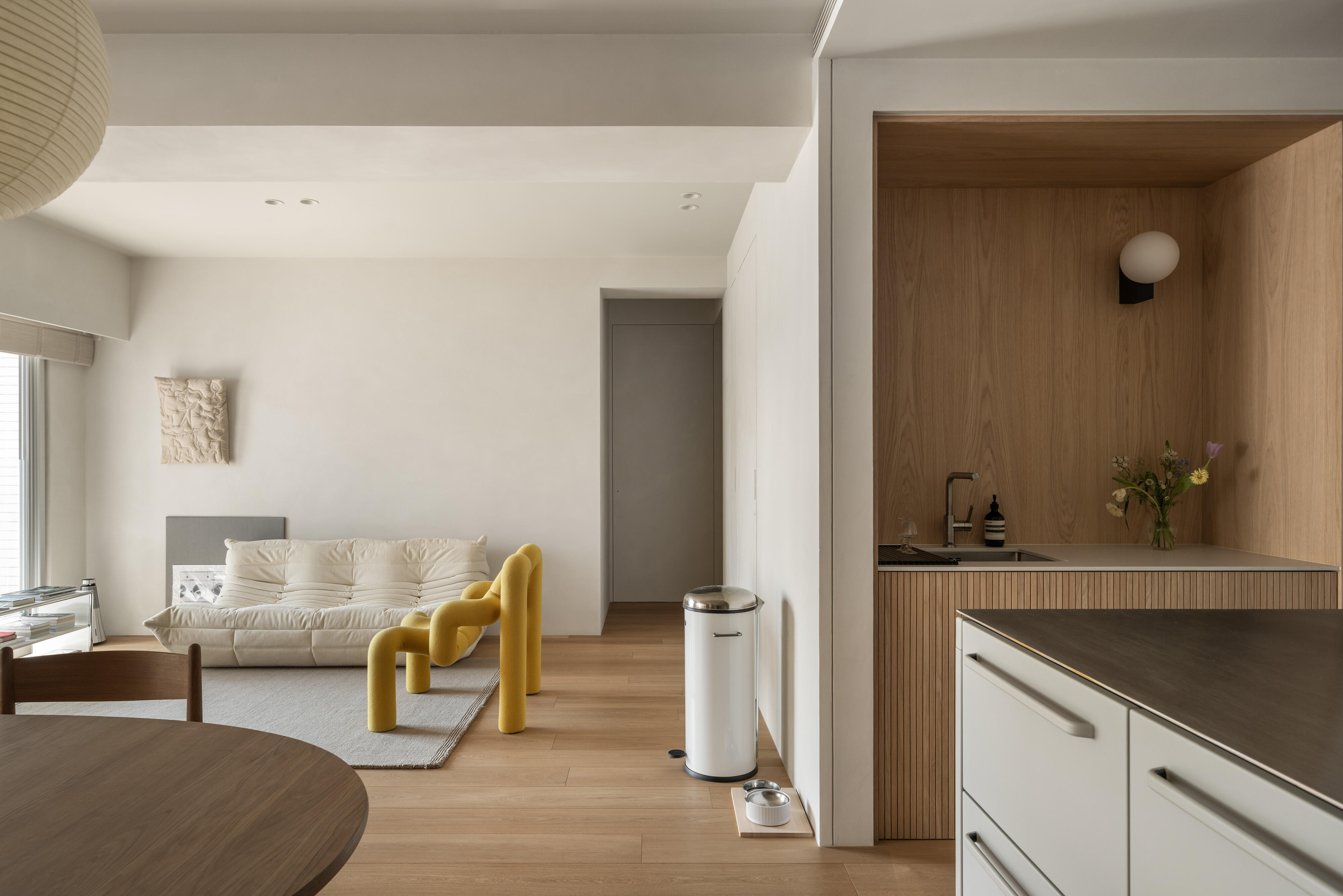 空間的劃分與配置確定後,透過溫潤色調及自然的材料如實木及礦物塗料,塑造乾淨與溫暖的氛圍,再搭配家具的選擇增添豐富度,保留空間的自由彈性,讓空間作為生活的背景,包容不同時期的變動與喜好。